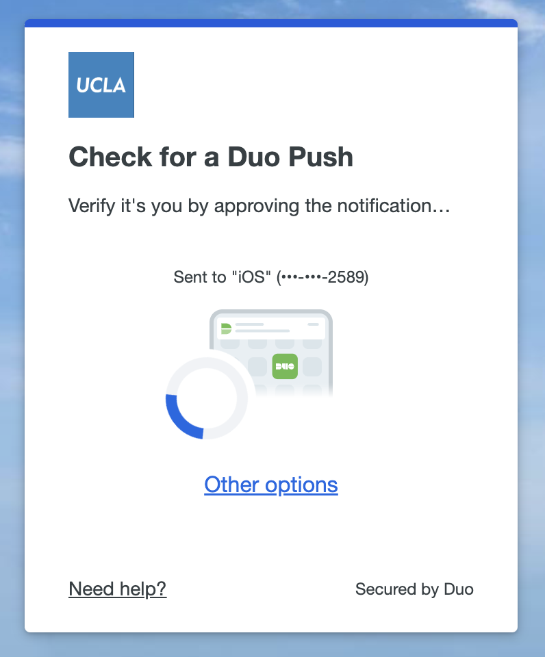 4. Check Duo Push window appears, please check your phone or follow the instructions on how you normally access the duo push to login to your account.